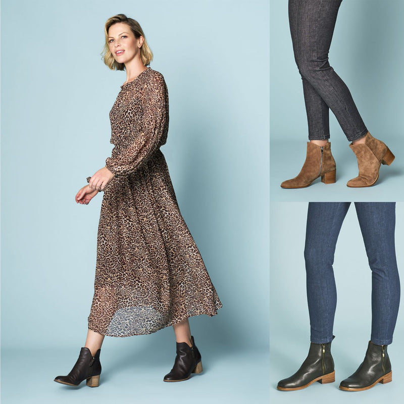 Products pictured from left to right, top to bottom: Seine Double Zip Ankle Boot in Chocolate; Sierra Suede Boot; Elodie Leather Boot