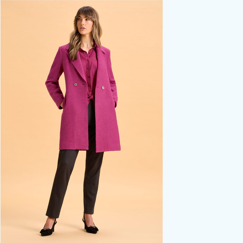 Need to stay warm? Our statement Boiled Wool Jacket is available in a vibrant rose-pink tone and is a cosy and warm option for winter and a key piece of our new Catriona Rowntree collaboration. Crafted from premium Australian wool and viscose, this jacket has a narrow double-breasted design and self-fabricated waist tie for elegant ‘French-Trench’ wrap fastening. Delight in the raw cut detailing and Blue Illusion monogrammed lining, featuring Catriona’s signature wheat motif, said to bring the wearer good luck! Fancy browsing Paris’ boutiques and alleyways with a bit of French mystère? Simply try on this rose-pink wool jacket with a matching Peonies Wool Scarf and cat-eye sunglasses. Ooh, la la!