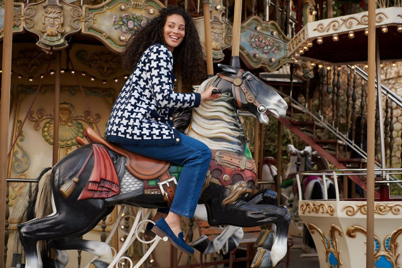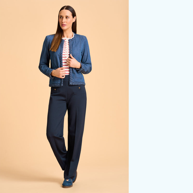 Embrace your inner-Frenchie with elegant lines, and let yourself be taken straight to the alleyways of Paris and its wealth of surprises. The classic Braid Trim Denim Jacket takes on a modern twist for our signature Bastille Day collection. A timeless piece that looks perfectly Parisienne - with a striped piece like our Ruffle Trim Henley T-Shirt and Sailor Ponte Pant. For this denim jacket has an elevated feel with its generous denim braid trim detailing and is designed to sit comfortably above the hip. Add a pop of chic to your finished ensemble, with a Petite Tote Crossbody Bag that says, c’est si bon!