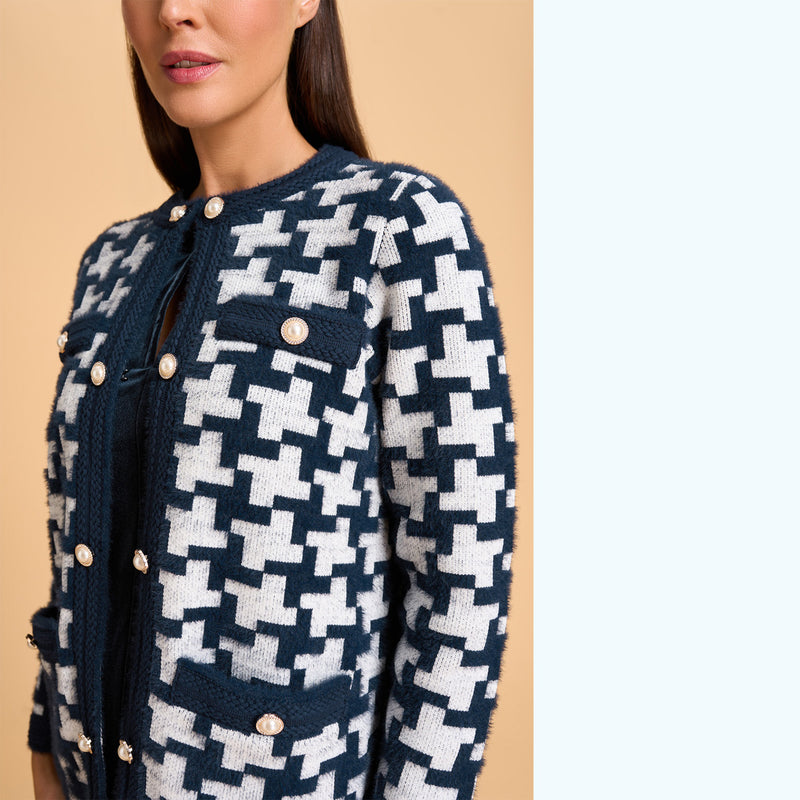 Spark a note of chic at your Parisian soirée with this soft, long-line Faux Fur Cardigan, a cosy and sophisticated option over your favourite pair of jeans. Featuring a distinctive Ink Houndstooth jacquard and edge-to-edge styling, this cardigan is an homage to French designer Coco Chanel who made houndstooth a wardrobe must-have in the 1920s. Delight in the statement buttons, braided trim detailing and discover this cardigan’s timelessness for yourself. Merveilleux!