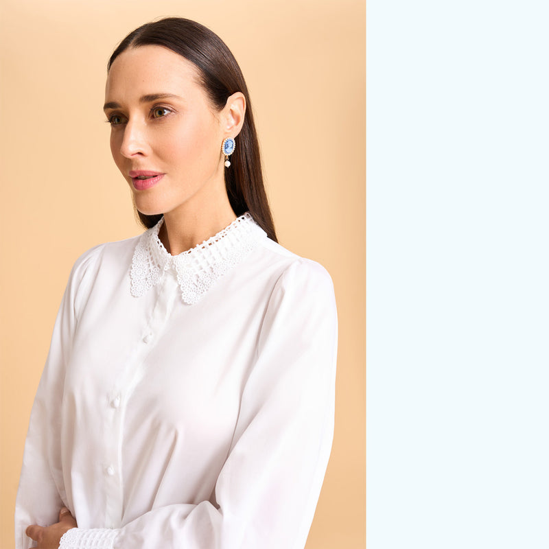 From our Bastille Day collection comes this French-inspired, crisp cotton shirt. The perfect piece for office wear or a day out, we particularly love the intricate detailed lace trim collar and cuffs as well as the forward side seam which creates a flattering silhouette. Every wardrobe needs a timeless white shirt comme ça. Pair it with your favourite Bengajean® and loafer for a parfait finish!