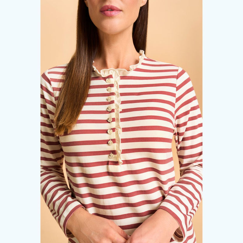 Ooh, la la! Usher in France’s day-of-liberté with soft patriotic stripes and classic lines with our Fairtrade certified t-shirt: a special part of our Bastille Day collection. With a timeless dusty pink stripe à la Française, this long sleeve t-shirt has a flirty finish with a ruffle collar trim detail. For a fun nautical feel, pair it with our Sailor Ponte Pant in Ink, and our braided denim jacket with a pair of penny loafers.