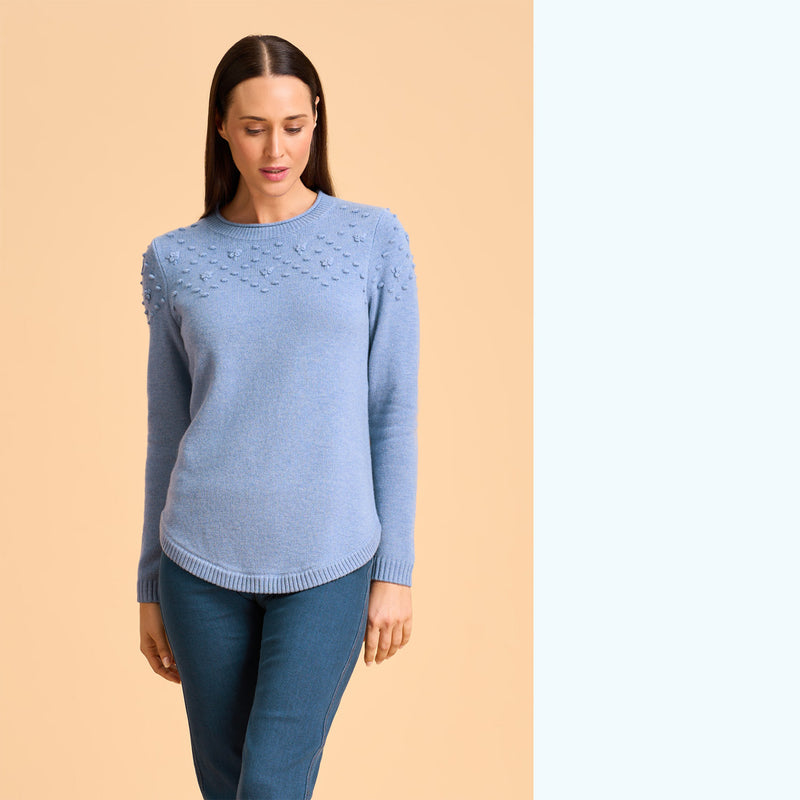 Embrace an armoire of soft patriotic couleurs with a Periwinkle jumper with popcorn detailing. This Hand Embroidered Wool Jumper is crafted from 100% Merino wool and features beautiful floral and popcorn embroidery along the neckline as well as a flattering curved hem. This beauty will keep you snug and warm all winter long! Pair it with a Glass Heart Earring, inspired by Venetian glass designs. These lightweight drop earrings are both delicate and whimsical. A multicoloured heart with a metallic centre, instantly adds a bit of fun to your outfit without overpowering your look. Or if you love a scarf, our Paris Watercolour scarf, evoking a postcard feel, as the design of our transeasonal scarf is a love letter to France. Crafted from modal and linen, with notable landmarks and typical Parisian streets with a moody blue border, what better scarf to wear in celebration of le quatorze Juillet?