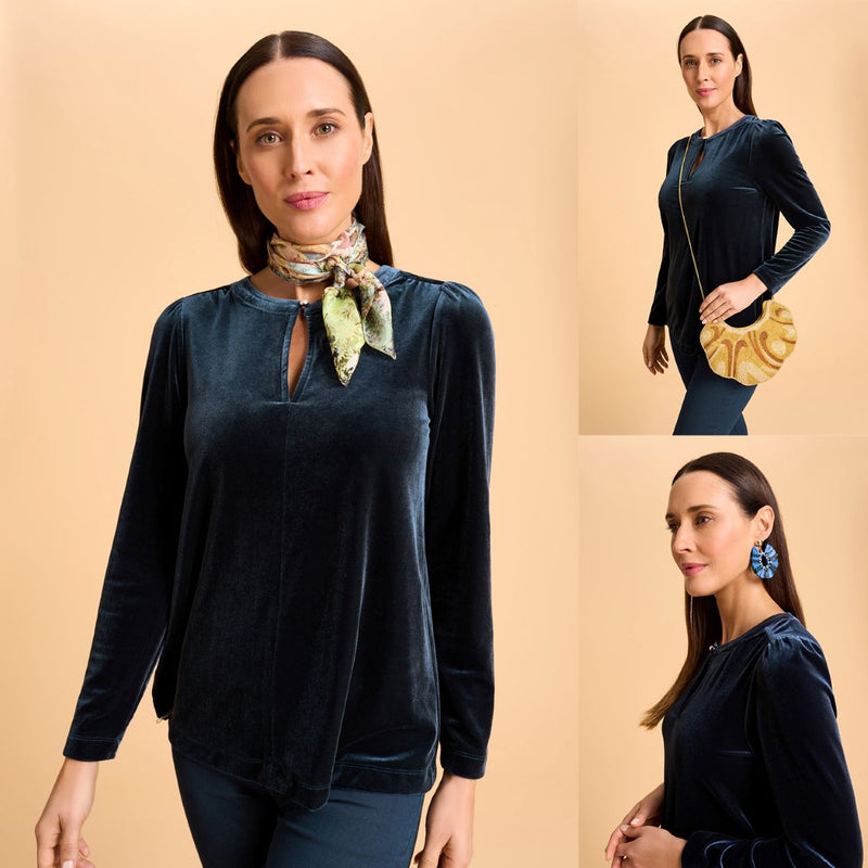 Velvet is having a moment this winter, and our Velvet Keyhole Top provides a tasteful base for effortless styling! We particularly love adding a colourful neckerchief and dressing this top up with a casual pant. Crafted from recycled polyester, this garment’s creation diverts approximately 160 500ml PET bottles from landfill. It’s truly an elegant piece not to be missed. Speaking of a scarf to celebrate Bastille Day, this beautiful and soft French Tapestry Scarf in a square neckerchief style is crafted from 100% silk habotai and is reminiscent of the woven tapestry art of 18th century France! Even better? Choose a unique accessory that is almost good enough to eat! Drawing on the oversized croissant food trend, let our playful Le Croissant Beaded Purse become your favourite daytime companion. A limited edition exclusive to Blue Illusion, Francophiles and collectors will love this piece! Fully beaded on one side with metallic thread, this purse can be used as a clutch, cosmetic bag or crossbody bag for all your essential items. Going out après-heures? Elevate your ears with our unforgettable Blue Fray Earrings. Bold and contemporary, these party earrings are a stand-out: with Ink, Blue and Gold colours instantly completing an edgier modern look en vogue.