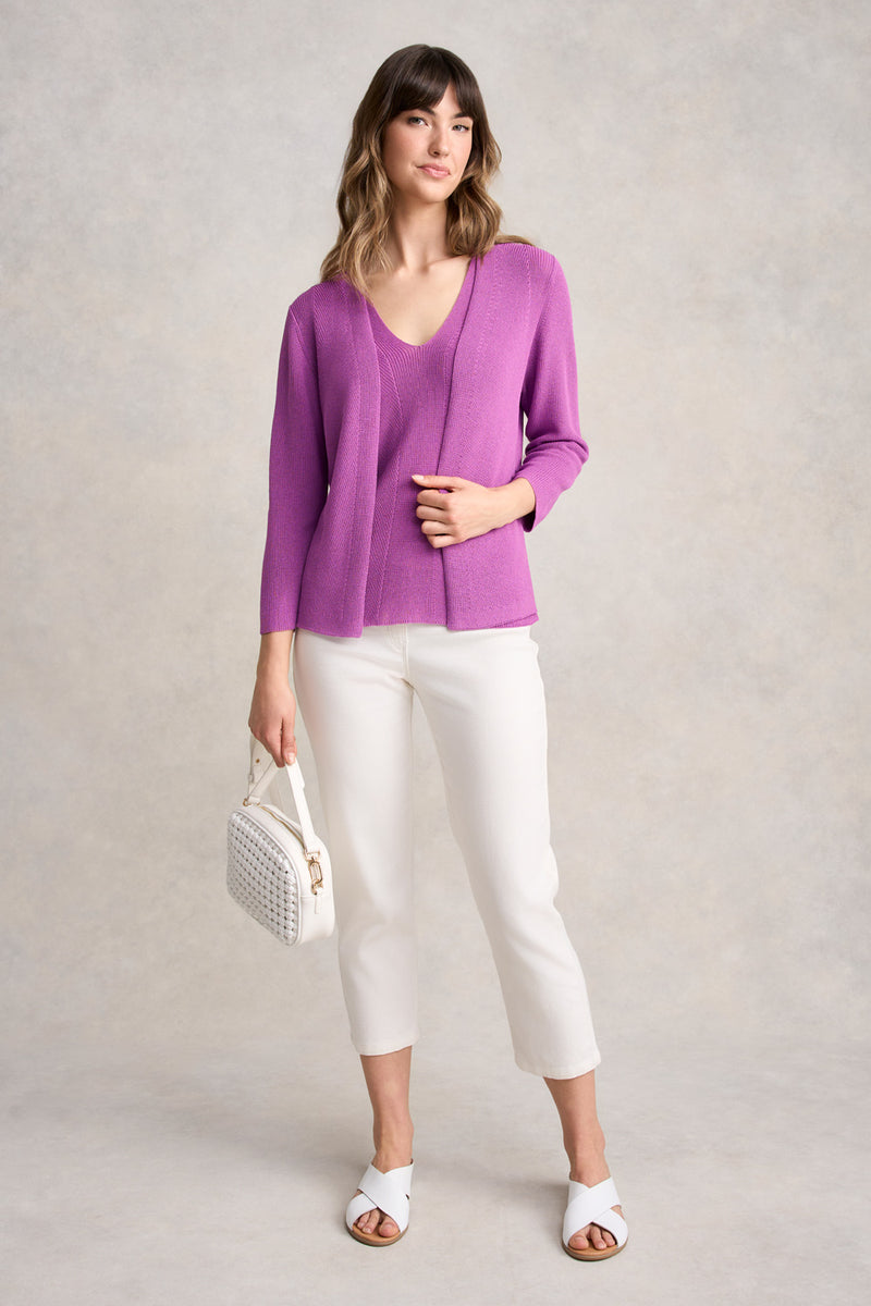 Bronte wears our Knitted 3/4 Length Cardigan over our Linen Mix V-neck Top.