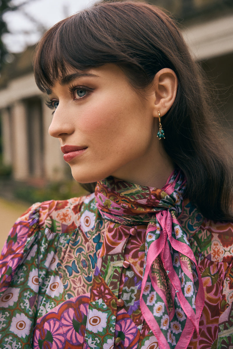 Capture the look: Pair the georgette flutter sleeve dress with the Marrakesh print scarf either tied in a slip knot around your neck or in your hair as a bandana. Complete the look with the cluster droplet earrings for that essential je ne sais quoi.