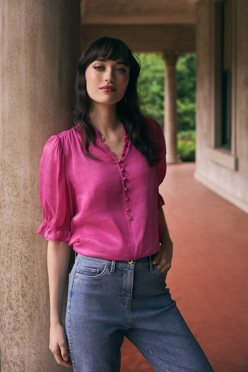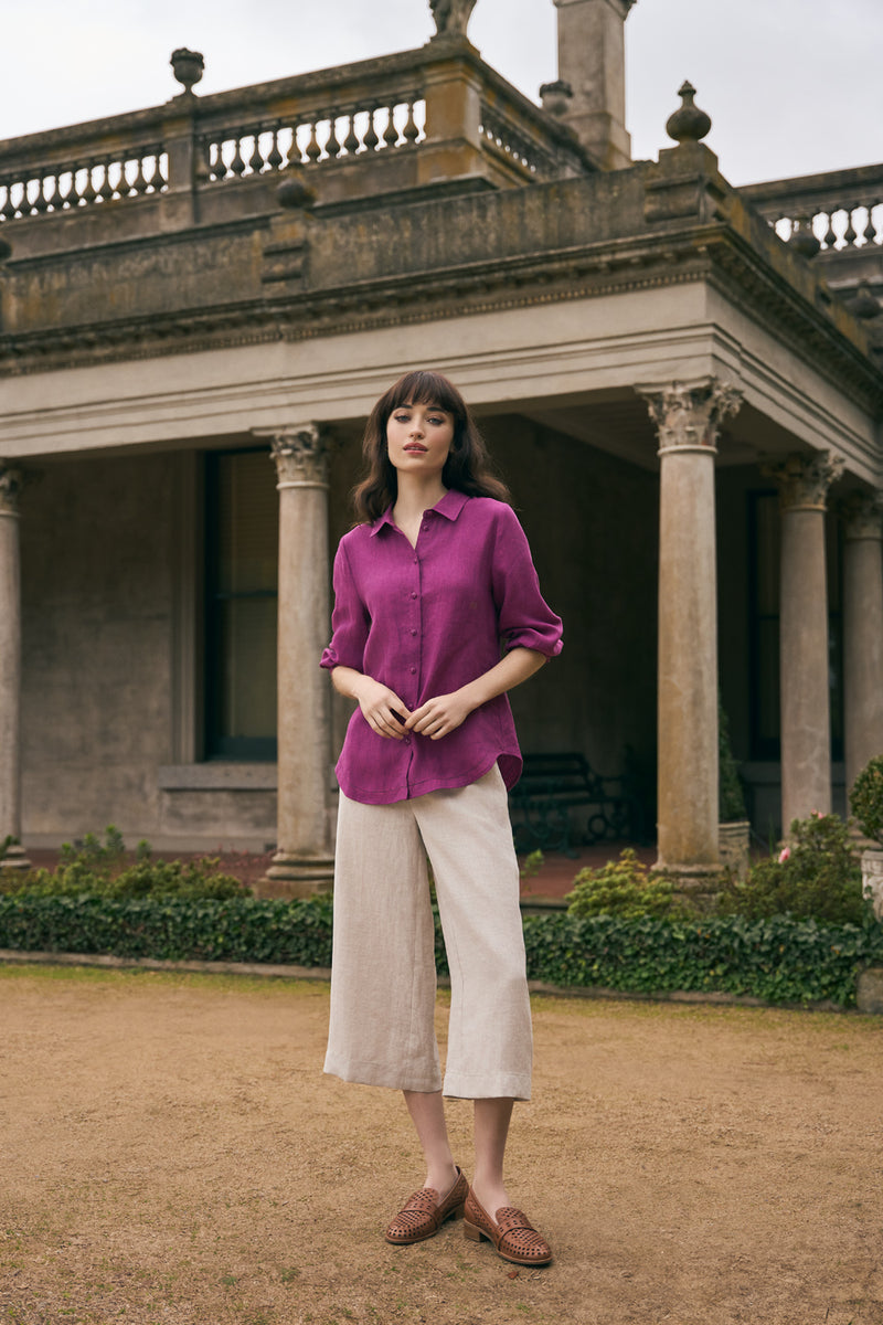 What to wear: The ¾ sleeve linen shirt and the ⅞ tapered pant offer an ideal blend of comfort and laid-back sophistication, parfait for a café with friends or a trip to Morocco. Complete the look with the Hillary heeled loafer, crochet Raffia woven basket, and the Moroccan swirl earrings.