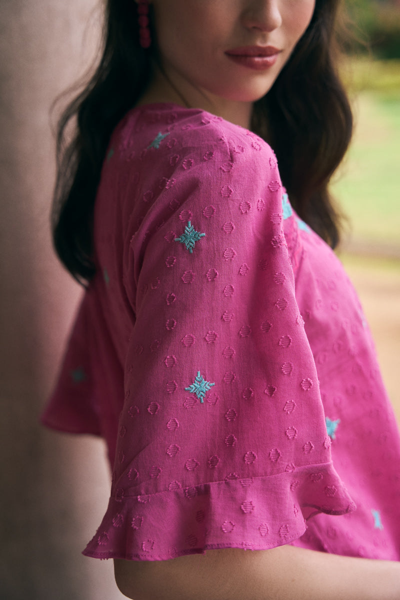 Capture the look: Style the embroidered blouse with the Classique 25 denim jeans to incorporate Moroccan-style effervescence into your spring/summer wardrobe. Accessorise the look with the fuchsia bauble hoop earrings and the Camilla sneaker for a modern take.