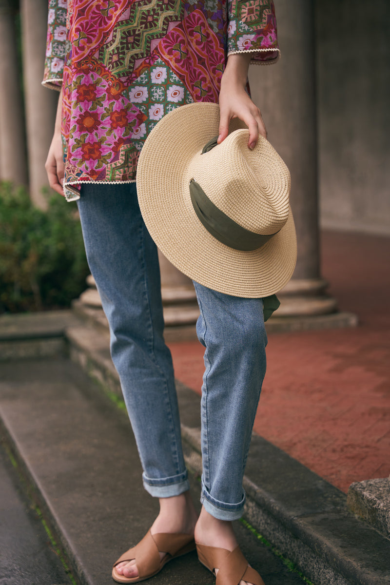 Capture the look: Drape the trim detail kaftan over the Classique 25 jeans for an effortlessly chic spring look. Complement the outfit with the Harli cross strap sandals in tan, Moroccan swirl earrings, and the Belle Bow trim fedora.