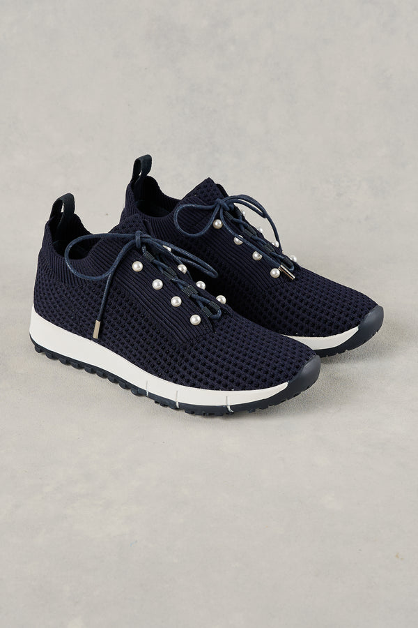 Blending sporty ease with a touch of glamour, the Perla Knit Sneaker in Navy features breathable knit construction and slip-on styling. Pearl detailing and a soft leather sock elevate this everyday essential to something très chic.