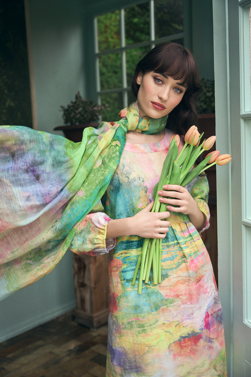 Create the look: Pair the printed linen dress with the matching abstract landscape linen scarf—