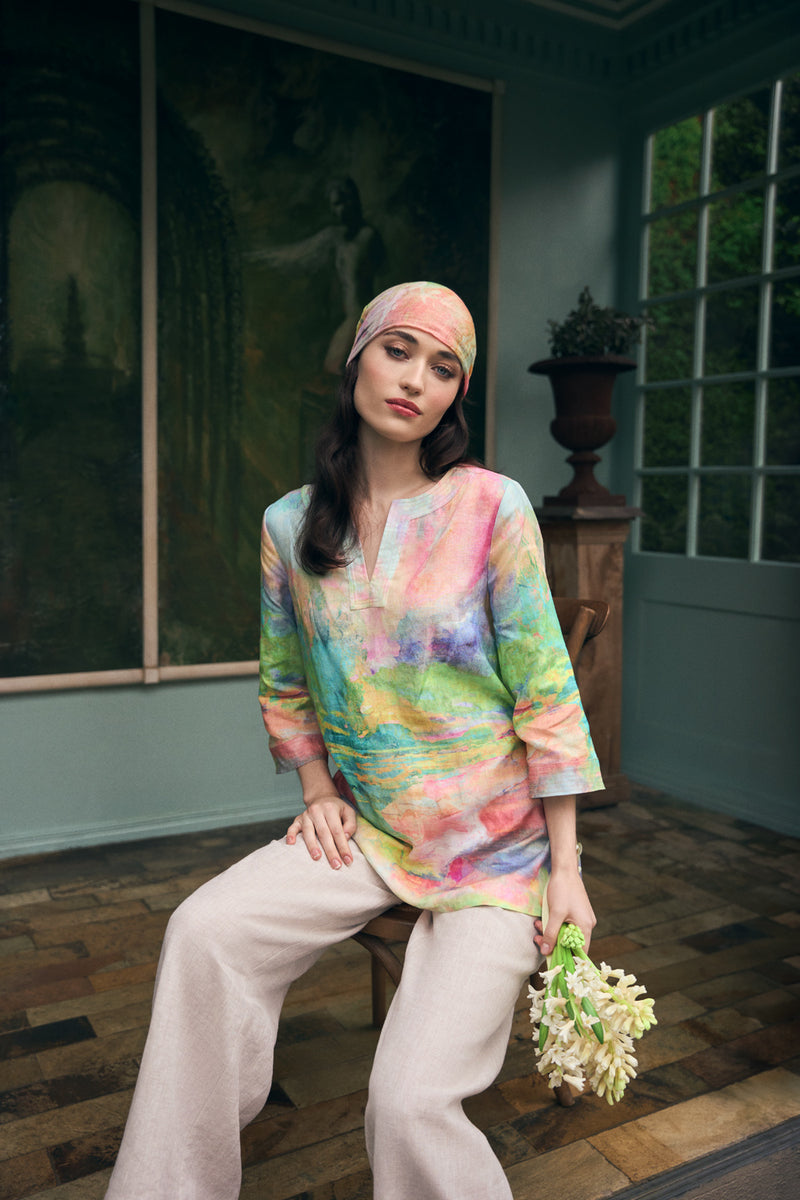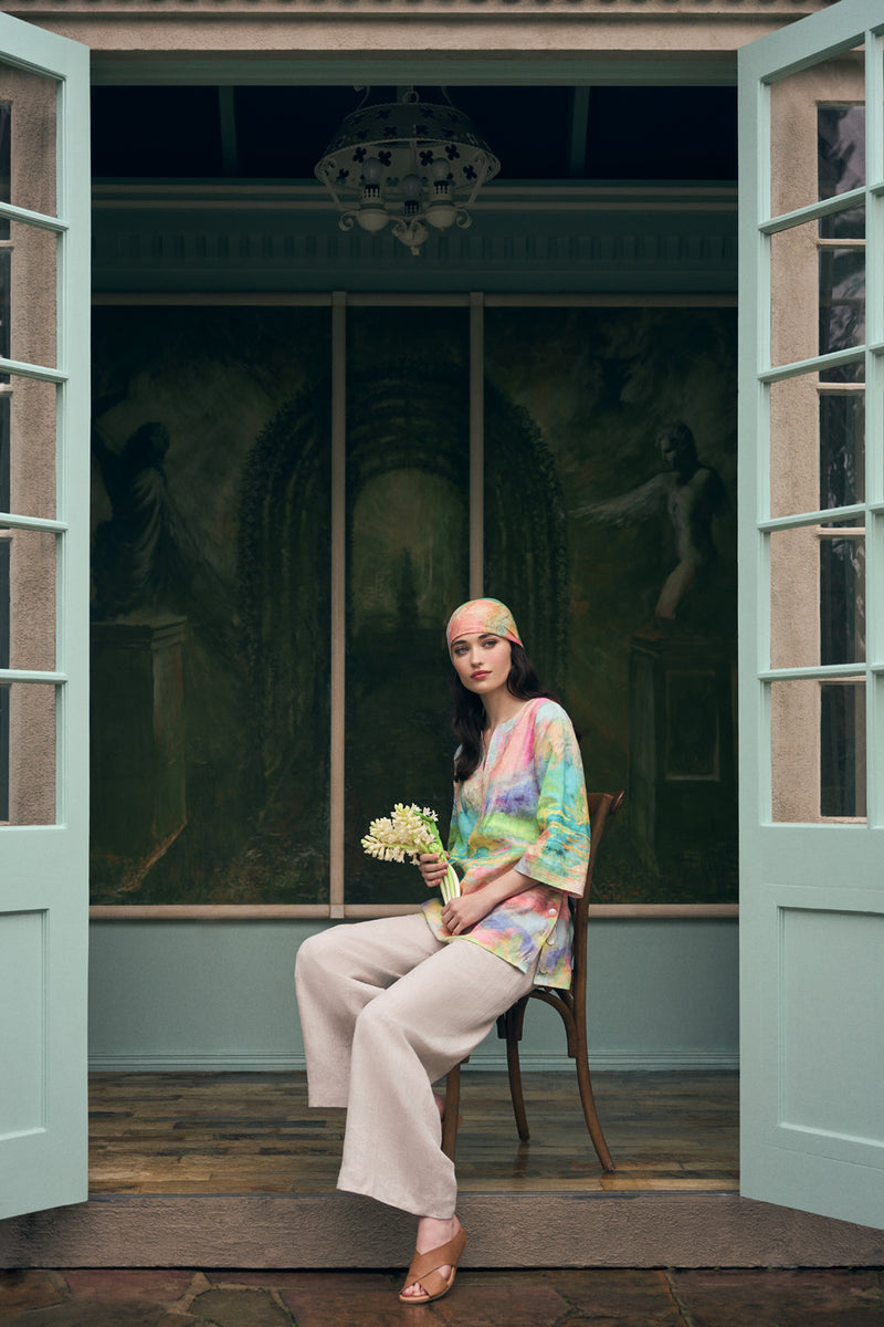 Create the look: Slip into the printed linen tunic and the full length waist tab linen pants. Accessorise with the Abstract Landscape linen scarf and the Harli Cross sandals.