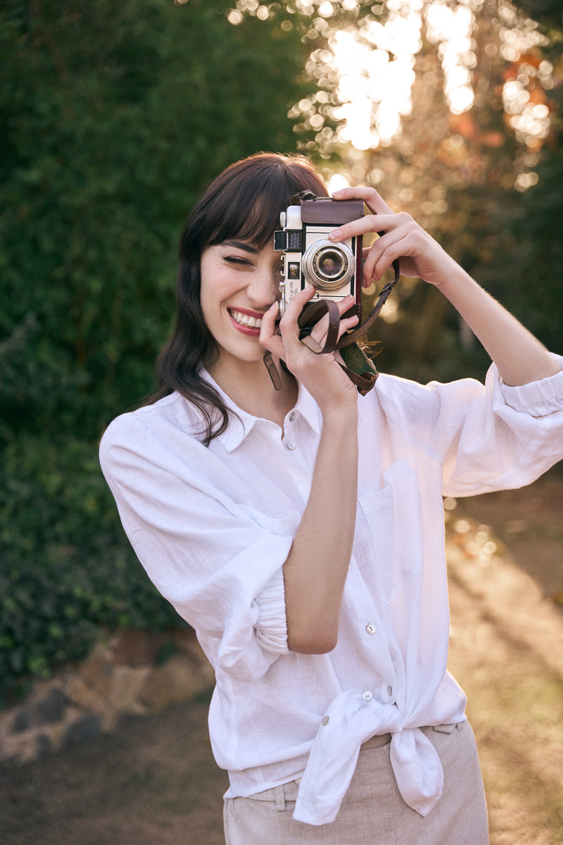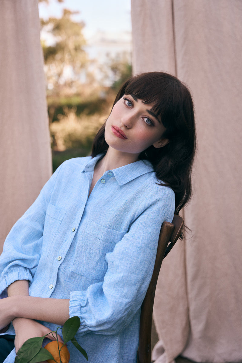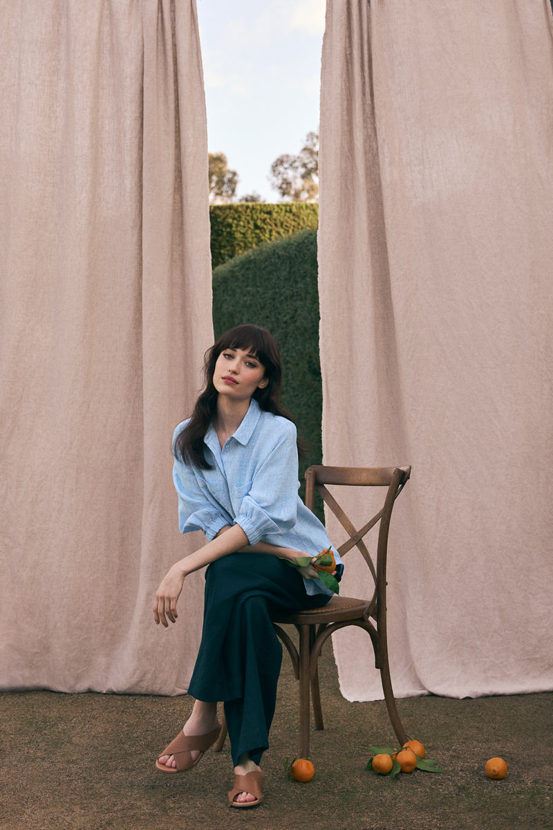Create the look: Style the French linen shirt in blue with the wide leg linen pants in ink.
