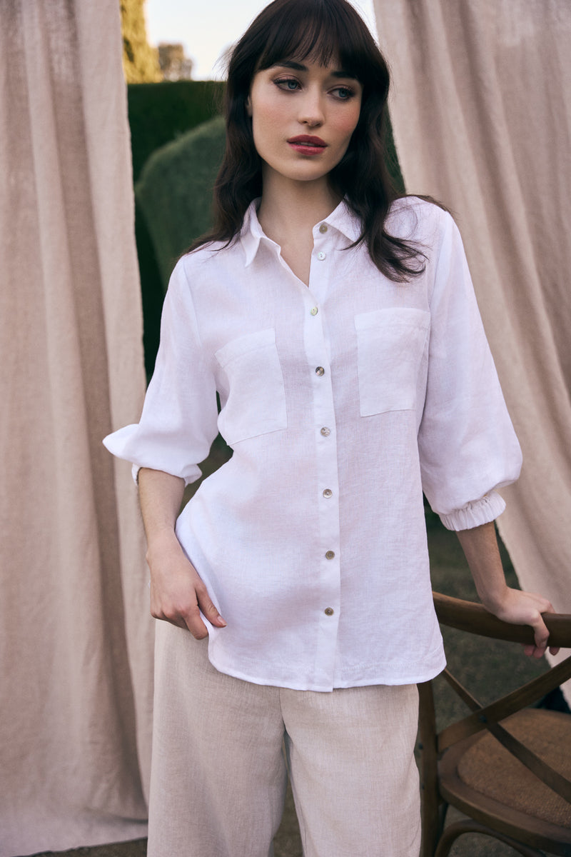 Create the look: Style French linen shirt in white with the ⅞ wide leg linen pant and pair with the Hillary heeled loafer.