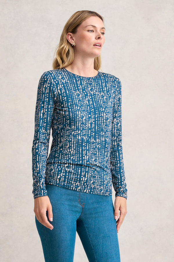 Crafted from LENZING™ ECOVERO™ certified viscose, our Long Sleeve Crew Neck Top in Navy and Cream combines a contemporary Linear Dot print with classic comfort. Pair it with our signature Bengajean® for a look that is casual yet chic.