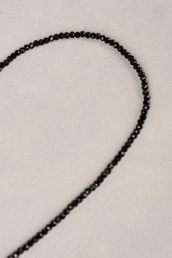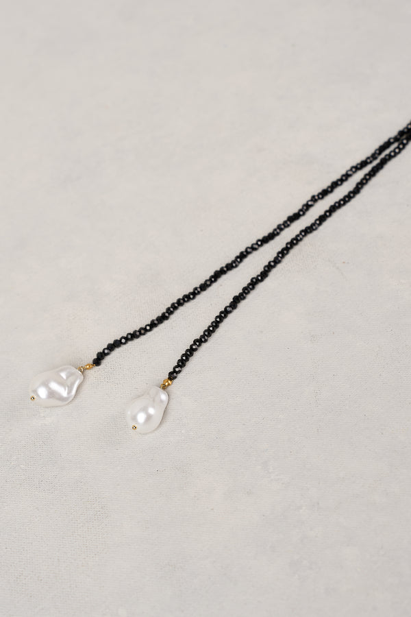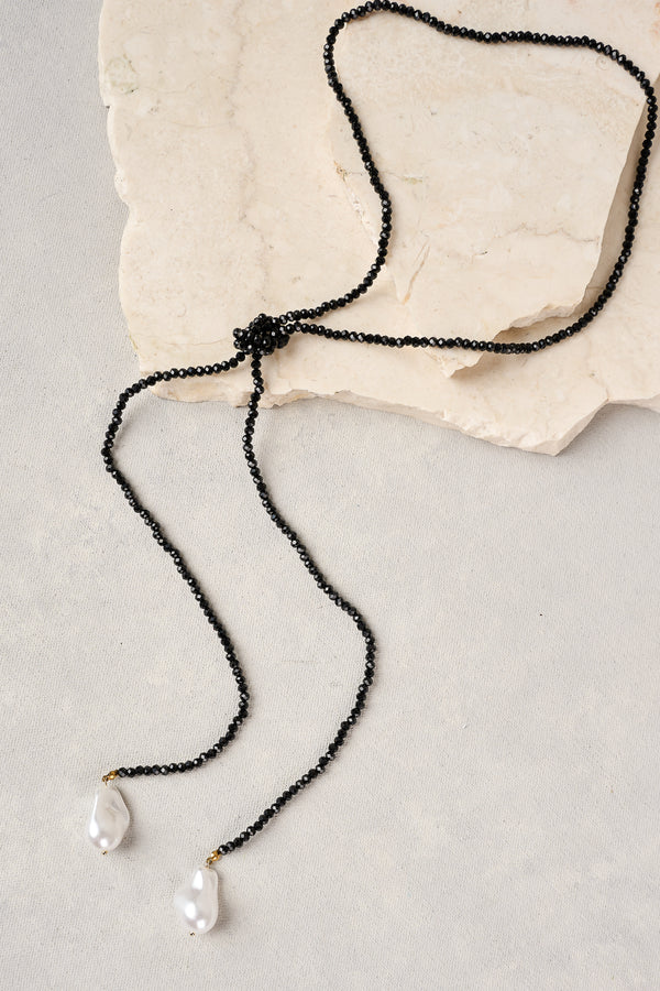 The Faceted Rope Necklace makes a bold statement with its black crystal base and baroque pearl pendants. Finished with 18k gold-plated hardware, it’s a striking blend of texture and tone. Dramatic, elegant, and just a little decadent.
