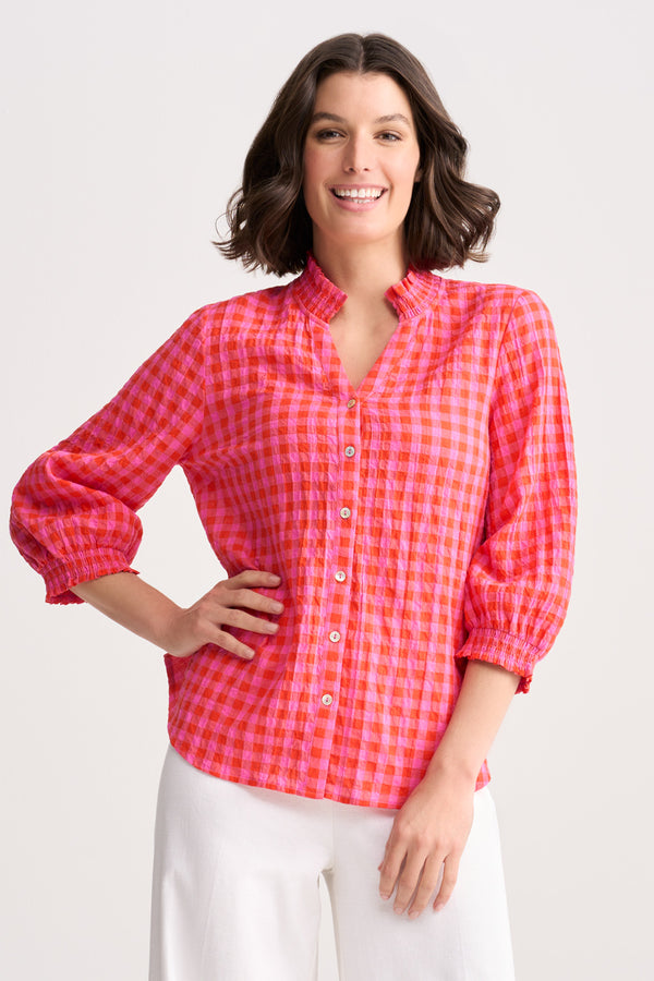 Gorgeously textured, our Cotton Crinkle Shirt features a playful Pink and Orange Gingham. Other details like a shirred high neckline, blouson sleeve and overall lightweight feel makes this shirt a great warm weather option. Wear it with our Charcoal Denim Bengjean® for elegant, off-duty style.